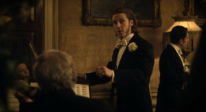 Franny’s mattress may have cost three grand, but he’s got serious competition from Quinn and Lonsdale for the best bed. Speaking of whom.. there are some memorable moments in screen history where a character makes a lasting impression in their opening scene, for example Ursula Andress emerging from the sea in Dr No. If you’ve seen Adam’s most recent role as Lord Lonsdale in A Thousand Blows, then you will understand. This character is unlike anyone Adam has played. The man is an aristocratic buffoon, the sort of person Oscar Wilde was referring to in his famous quote about fox hunting, “the unspeakable in full pursuit of the uneatable.” He is a questionable man of his time and class, but he does produce some wonderfully idiotic moments. The much anticipated arrival of the Chinese delegate becomes a catalogue of faux pas, misunderstandings and bluster. Lonsdale’s flamboyant reveal of the silverware is ridiculous, he conducts a chamber orchestra with the most insipidly smug expression on his face (it reminds me of the cheesy grin to camera which 1970s UK pianist Bobby Crush used to do), and he ushers his guests around like cattle by flamboyantly waving his arms about. I have a grudging soft spot for him for agreeing to take on a prize fighter in a bare knuckle boxing match and accepting his defeat like a good sport old boy, standing in front of the Chinese VIPs looking bedraggled, with his shirt hanging out and dabbing a cut to his head.